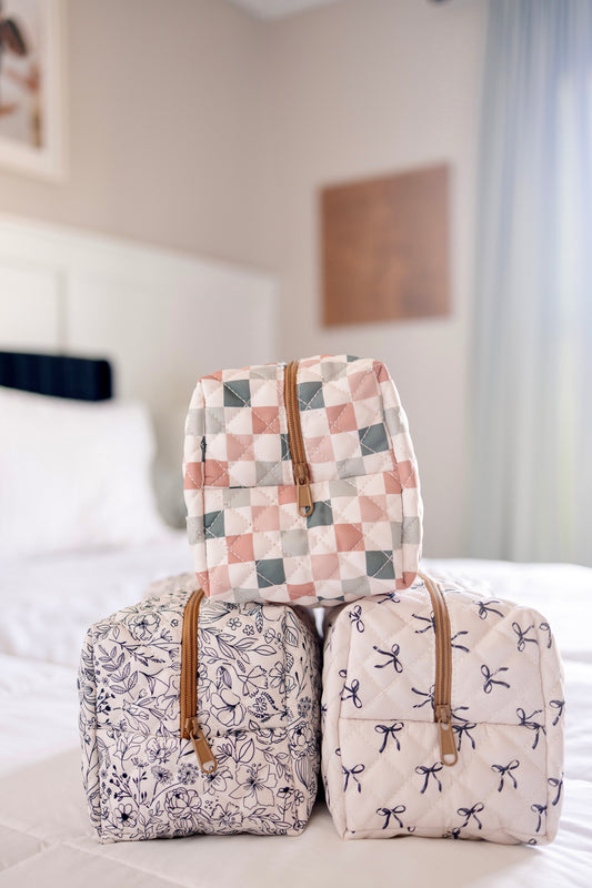 Quilted Carry All Pouch for Women – Large Makeup Organizer Bag, Stand Up Toiletry Case, Wide Zipper Opening, Cute Travel Pouch